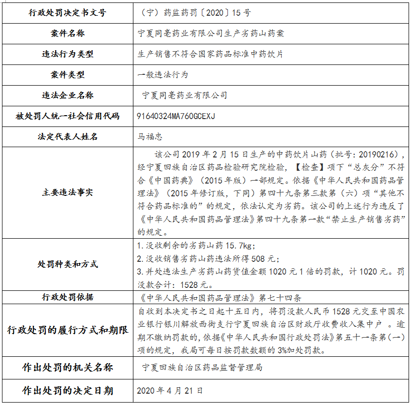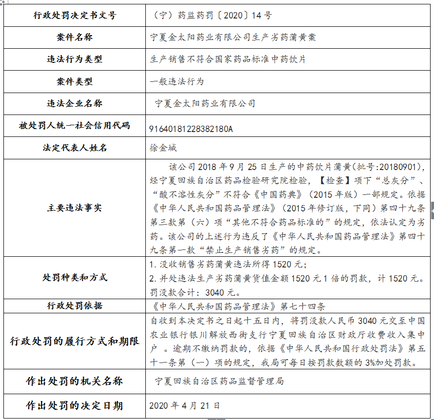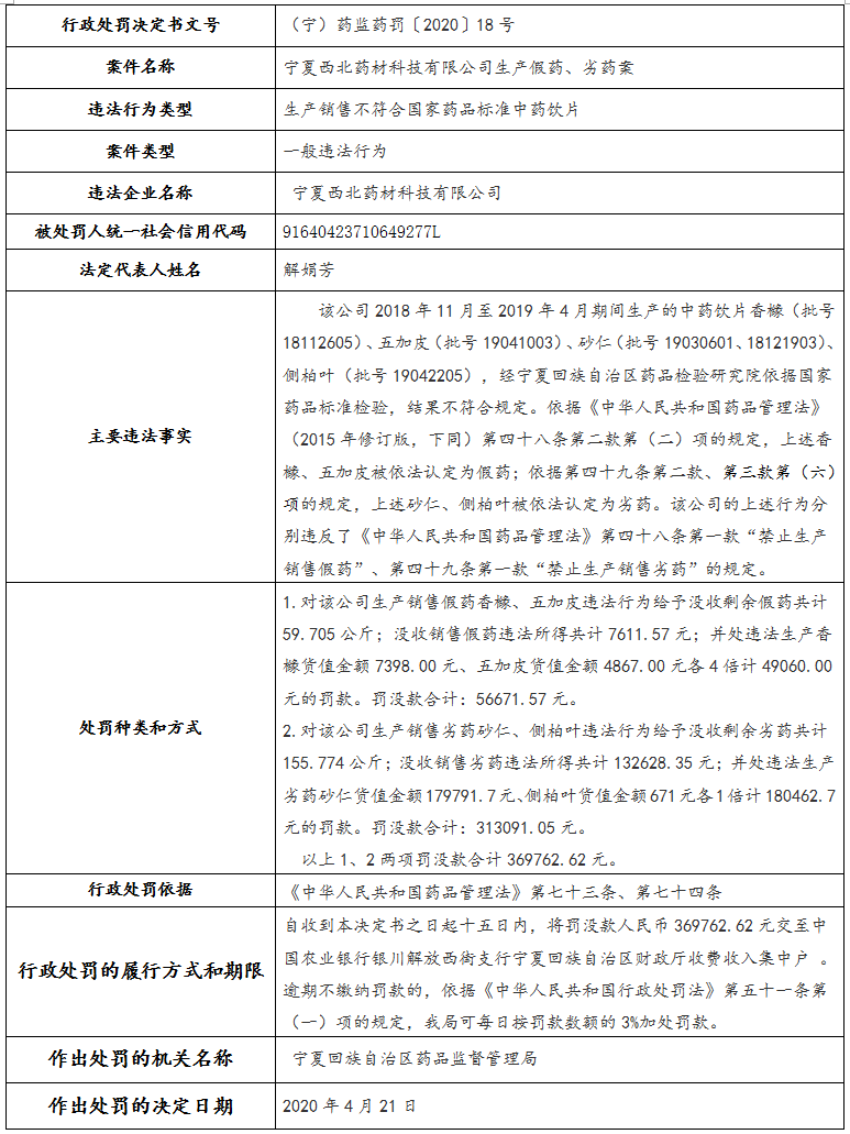 宁夏药品监督管理局关于5起药品行政违法案件信息公示表(三)