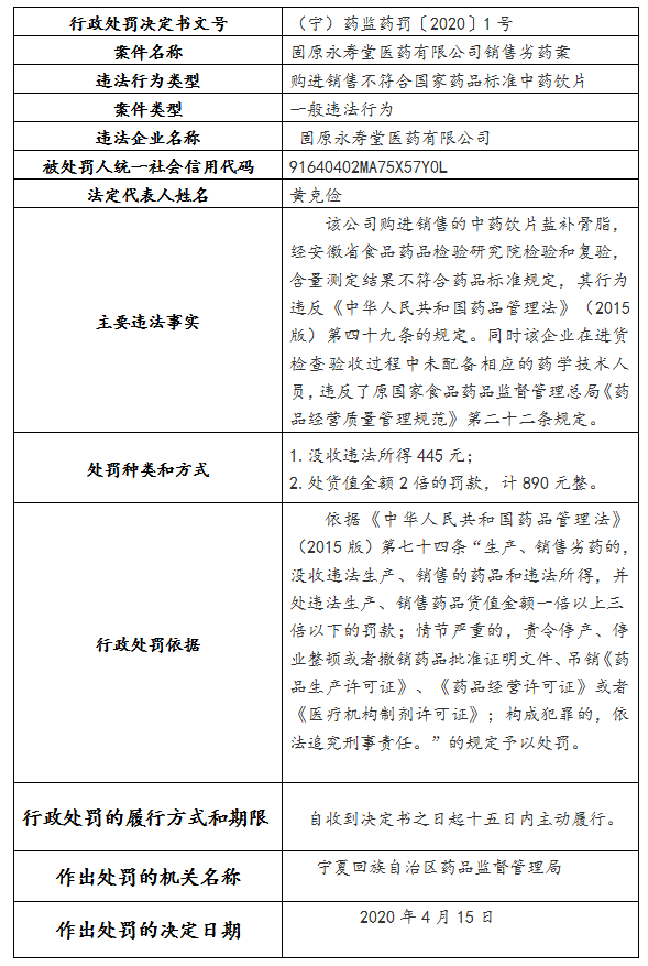 宁夏药品监督管理局关于3起药品行政违法案件信息公示(五)