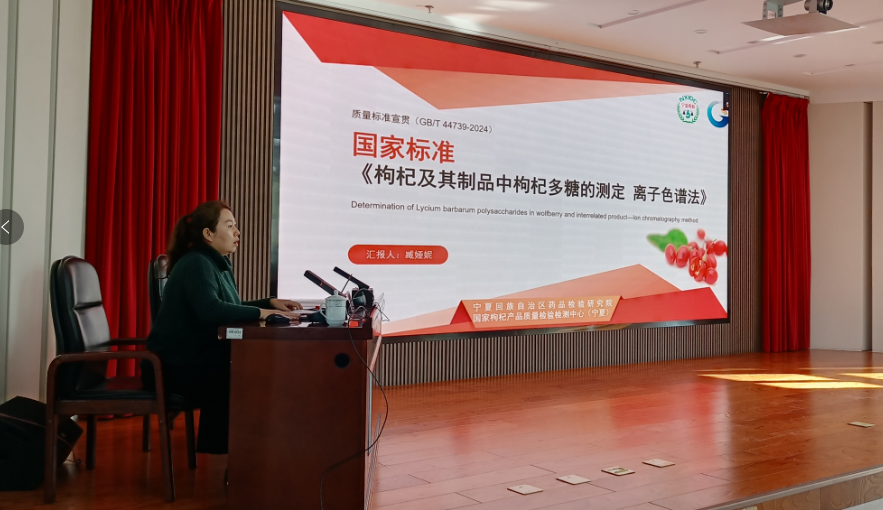 培训会上自治区药检院2名同志详细解读了枸杞干果、枸杞原浆的质量标准,重点分析了企业在执行《食品安全地方标准 枸杞原浆》(DBS64/ 008-2022)过程中存在的问题和误区,并介绍了2024 年发布的《枸杞及其制品中枸杞多糖的测定 离子色谱法》国家标准,阐述其制定背景,适用范围及对规范枸杞及枸杞原浆市场的作用。